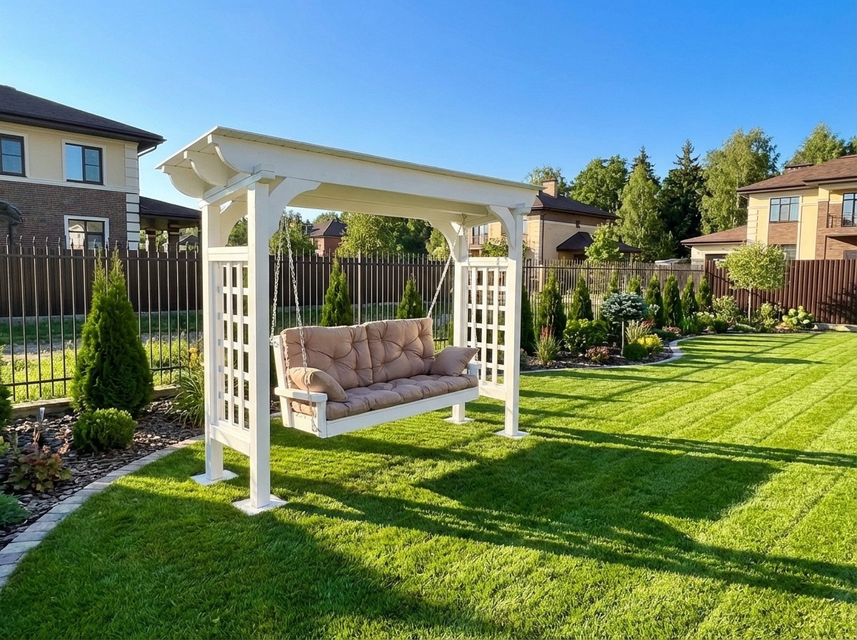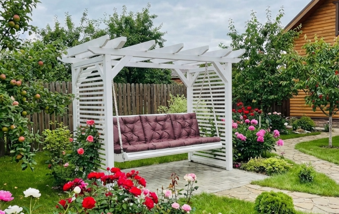 2. Нестареющая классика и прованс. Белые или пастельные качели с изящными решетчатыми элементами («трельяж»), как на втором фото, — это воплощение романтики. Они идеально вписываются в ландшафт в стиле прованс, английский или деревенский сад. Такие качели прекрасно смотрятся в окружении роз, лаванды и других цветущих многолетников.