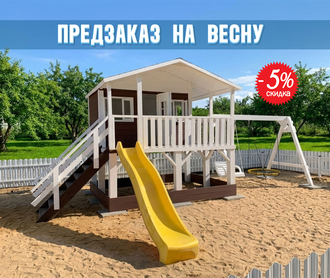 Вторая версия популярного детского домика "Американская мечта" имеет следующие отличия - добавлено деревянное сидение, отсутствует скалодром и рукоход.