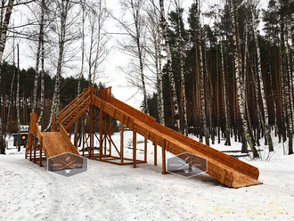 Большая сдвоенная деревянная горка представляет собой две горки - большую и малую, с 12-метровым и 4,5-метровым скатом, соответственно. Данная горка из дерева украшает собой многие парки г. Москвы и служит для развлечения детей разных возрастов. Парковая заливная горка совершенно безопасна, она выполнена из сухой строганной идеально отшлифованной доски, поэтому не может стать причиной получения травм.