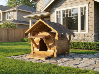 Эта деревянная будка отлично подходит для установки во дворе частного дома или на даче: гармонично смотрится на участке, сочетается с деревом, камнем и аккуратным газоном, а также подчёркивает заботу о питомце. Форма «бочки» делает будку особенно эффектной на фото и помогает выделить её среди обычных прямоугольных домиков. Если вы ищете будку для собак, которая одновременно функциональна и украшает двор, будка-бочка — один из самых удачных вариантов для современного участка.