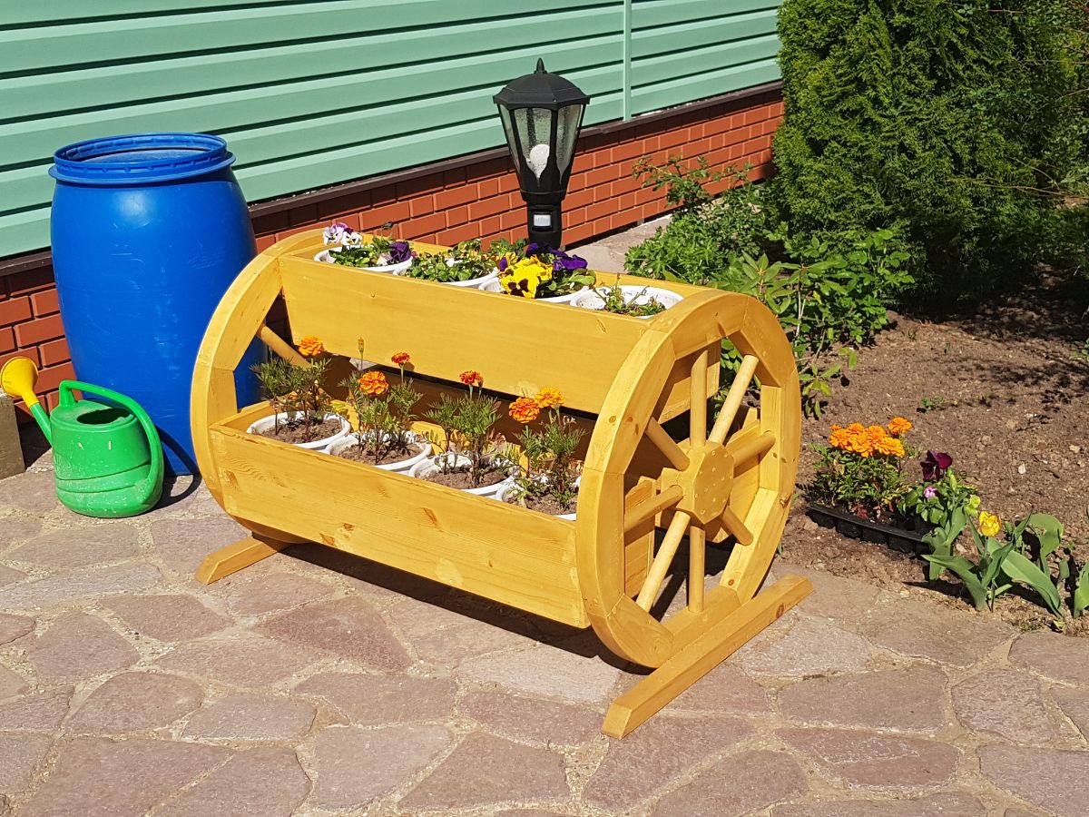 Необычная деревянная цветочница под названием "ТРИО" выполнена из материала сосна и представляет собой кашпо с тремя лотками из досок и двумя колесами по бокам. Такое декоративное кашпо будет прекрасно смотреться в саду в сельском стиле. Для того чтобы деревянные цветочницы сохраняли свой замечательный внешний вид на долгие года, материал пропитывается безвредным составом, замедляющим процесс старения.