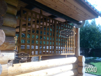 Терраса бани, деревянного или бревенчатого загородного дома, которая открыта со всех сторон не всегда выглядит привлекательно. Иногда создается впечатление, что чего-то не хватает. Возможно, деревянные шпалеры в квадратную сетку - именно то, что вам нужно. На фото представленны решетки из деревянных реек с выпусками из бруска с четырех сторон, что сделано не случайно. Дело в том, что баня из бревна со временем несколько деформируется, что сказалось и на проемах, которые не представляют собой теперь ровный прямоугольник. Перед производством шпалер был сделан точный замер, чтобы изделие подошло по размерам, исходя из того, что с разных сторон размеры разные. Ячейка у шпалер - 7 см, что не делает изделие, так сказать, "глухим" и в то же время надежно ограждает от чужих взглядов. Баня со шпалерами смотрится гармонично и интересно.