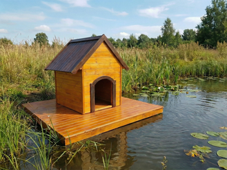 Деревянный домик для уток на плоту можно пустить по воде. Такое столярное творение украсит любой пруд - частный или парковый. Утки будут с удовольствием проводить в нем время, плот сделан таким образом, что он не может перевернуться и утонуть. Домик для уток из дерева на плоту можно купить в нашей творческой мастерской. По желанию габариты и дизайн изделия можно видоизменить.