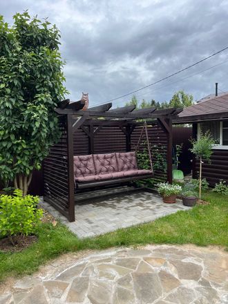 Пергола с качелями выполнена из клееного бруса и отборной доски с покрытием пропиткой или укрывным антисептиком в два слоя. В качестве максимального удобства рекомендуем заказывать вместе с текстильным комплектом из ткани Оксфорд-600.