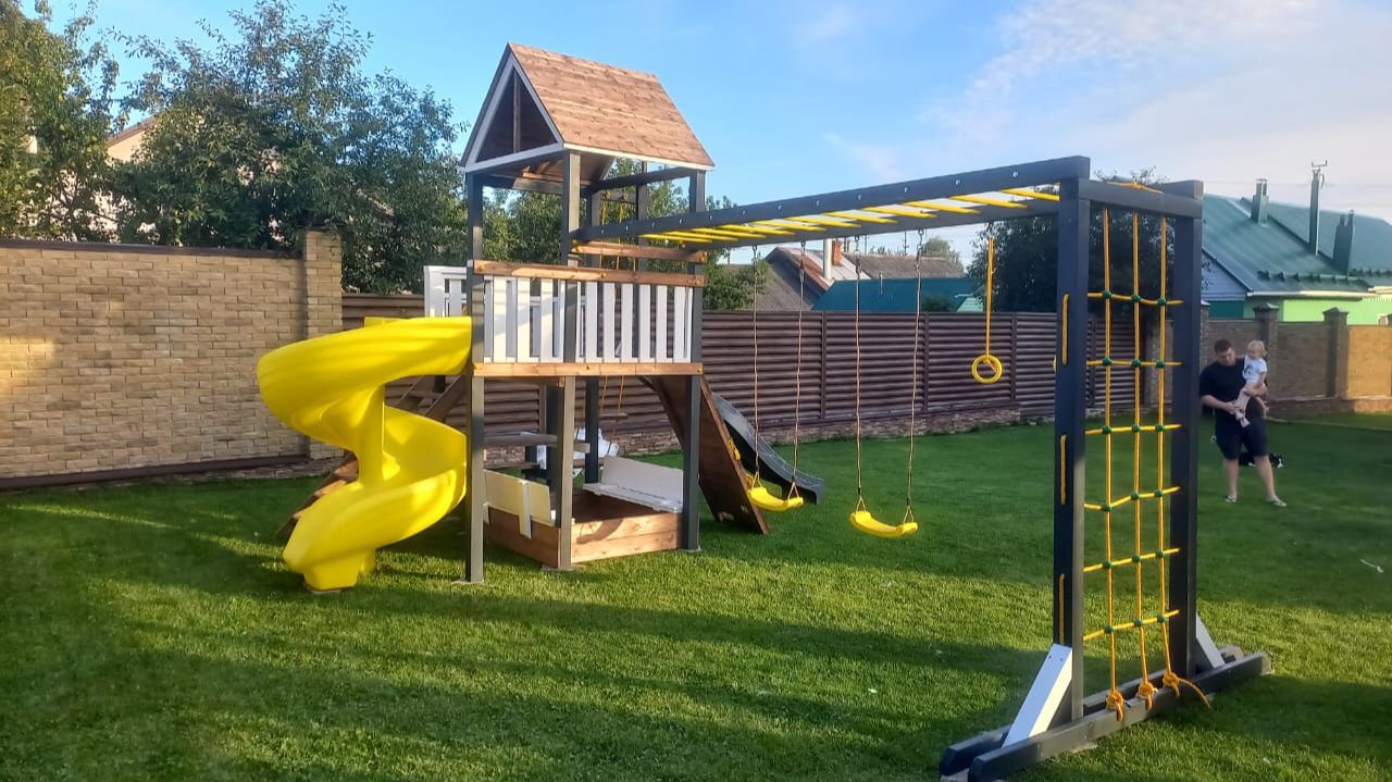 Спортивный модуль с рукоходом и сеткой для лазания - здесь комплекс с винтовой горкой превращается в настоящий тренажёр для развития силы, ловкости и координации. Ваши дети будут не просто играть - они будут расти сильными и уверенными.