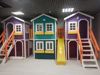 Детская игровая зона – это отличное место для увлекательного досуга детей. Вашему вниманию представлена детская площадка в виде трех двухэтажных домиков разного цвета. Данный игровой комплекс выполнен по предоставленным эскизам, что говорит о его индивидуальности. У нас можно заказать детскую игровую площадку из дерева по вашим характеристикам, в том числе по размерам, цвету и прочим нюансам.