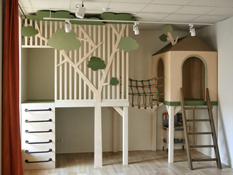 Привлекательность детского лофта во многом зависит от оснащения помещения. И не секрет, что детям нравится играть в домиках не меньше, чем развлекаться с аниматорами. Разработанная нами детская площадка в помещение для семейного лофта прекрасно впишется в интерьер любого развлекательного пространства. А такой элемент, как дерево, добавит изюминки и создаст приятную атмосферу.