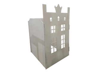 Самое экономичное решение для детских игр дома или в детском лофте: домик на пазах, который легко собрать и разобрать. Он выполнен из высокачественной фанеры сорта 2/2, тщательно отшлифован и скруглен. Совершенно безопасен для использования.