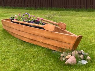 Декоративная лодка-цветочница из дерева прекрасно дополнит участок и оживит его красоту. Изделие смотрится очень органично в саду, и в внешне очень напоминает настоящую деревянную лодку. Единственное отличие – ее нельзя погружать в воду, но при этом можно и нужно усеивать цветами. У лодки нет дна, что необходимо для обеспечения правильного оттока воды при посадке внутрь живых растений. Лодка обработана антисептиками и окрашена в желаемый цвет, при этом в стоимость деревянной лодки уже включена и пропитка и покраска.