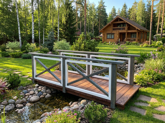 Такой декоративный мостик с поручнями станет не только функциональным элементом ландшафтного дизайна, но и символом единения природы и человечества, который придаст вашему участку уникальный и привлекательный вид.