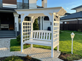 Деревянная пергола-скамья "Грация" - это место, где отдыхает душа! Она не займет много места в саду, но подарит бесценное время спокойствия и релакса.