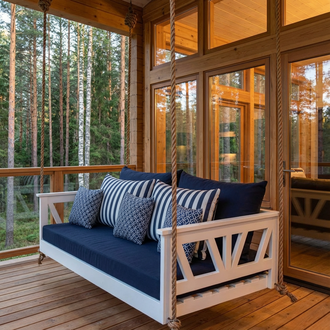 Подвесной диван на террасу из натурального дерева – это воплощение комфорта и стиля для вашего загородного дома. Элегантная подвесная кровать на террасу станет любимым местом для утреннего кофе, дневного отдыха с книгой или вечерних посиделок с семьёй под звёздным небом.
