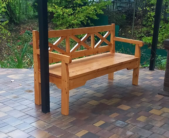 Все элементы обустройства дачи в идеале должны подходить друг другу. И наша скамья деревянная имеет внешний вид, который подходит под большинство стилистических решений. Перекрестье на спинке перекликается с излюбленным приемом оформлениях веранд дома в таком же стиле. Заказать лавочку со спинкой интересного дизайна можно в нашей творческой мастерской Кованое дерево.