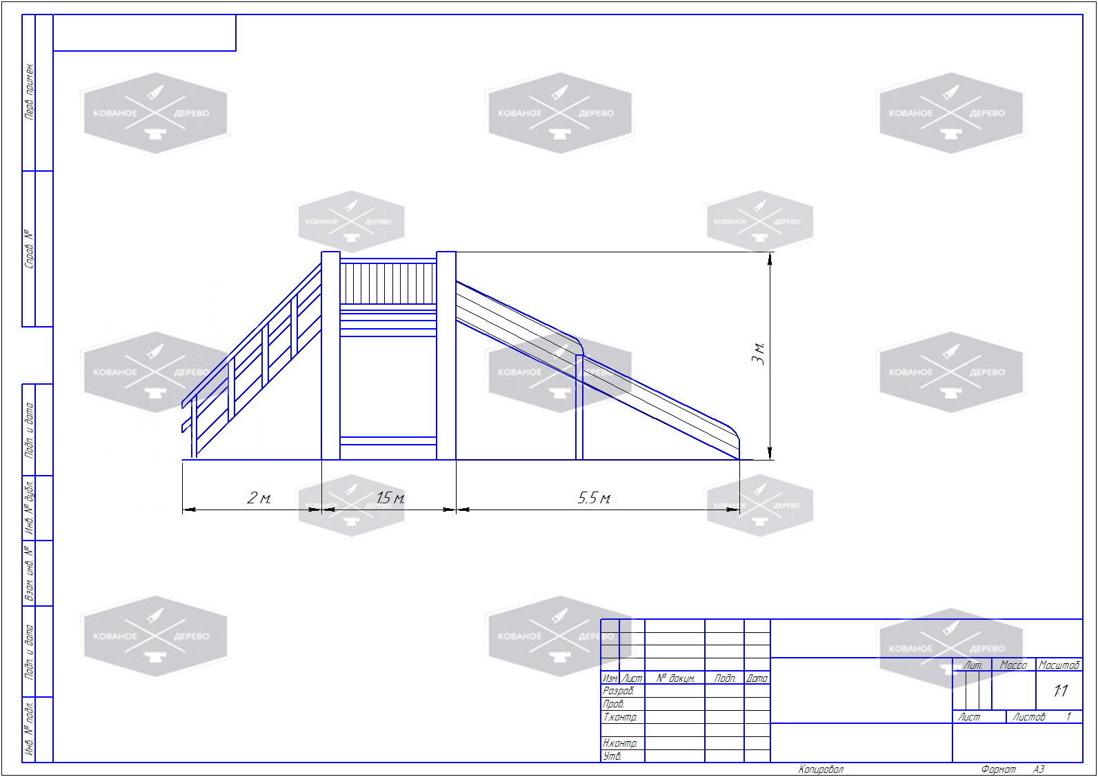 | Размеры | Длина ската - 6,0 м., общая ширина ската 1,50 м., площадка 1,50 х 1,50 м., высота общая 3,0 м., высота до ската 1,80 м., общая длина по земле 9,0 м., общая ширина 1,50 м., борта ската 0,42 - 0,28 м., перила 1,20 м. |