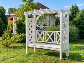 Беседка в виде перголы с одной скамьей и решетчатыми стенами – замечательный вариант места отдыха в тени сада. Беседка-навес имеет компактные размеры и красивый дизайн, вписывающийся во всех архитектурные стили. Для того чтобы сделать перголу с лавкой более привлекательной, по бокам можно посадить вьющиеся растения, которые со временем вырастут и красиво оплетут беседку, сделав ее поистине «живой» и красочной. Заказать изготовление перголы со скамьей можно в нашей производственной мастерской удобным для вас способом.
