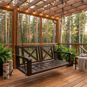 Терраса загородного дома - это место уюта и спокойствия. Атмосфера так и благоволит нежится на солнышке в теплое время года. И здесь как никогда уместен деревянный подвесной диван. Легкая конструкция на канатах или цепях позволяет расслабиться, неспешно покачиваясь. Наша модель подвесного дивана с перекрестьем на спинке подойдет практически на каждую веранду дома.