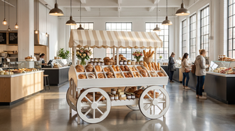 Телега подходит как для постоянной установки в зале, так и для временных торговых точек: удобно организовать демонстрацию новинок, дегустации, сезонные предложения и “островок” продаж в проходной зоне. Дизайн хорошо сочетается с ремесленным/крафтовым позиционированием и форматом арт‑пекарни.